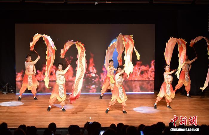 当地时间4月14日晚,巴西圣保罗,湖北大学龙狮艺术团演出剧照。记者 林春茵 摄