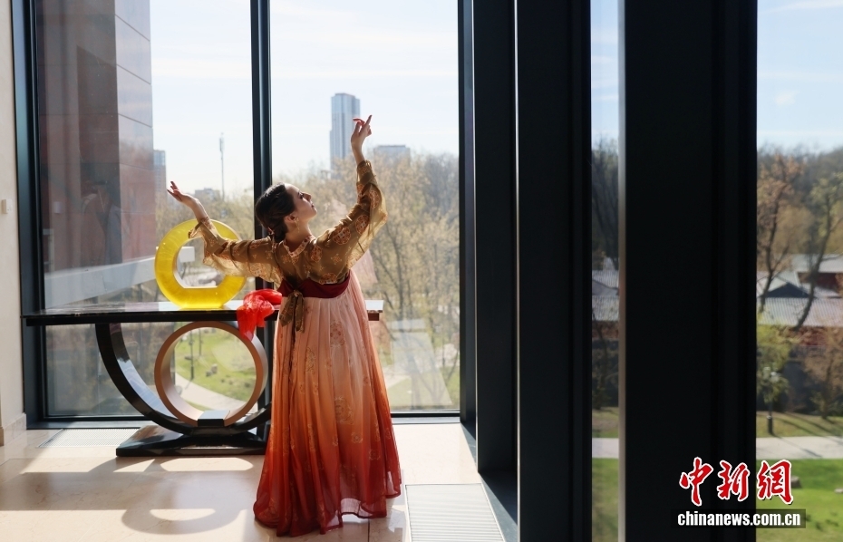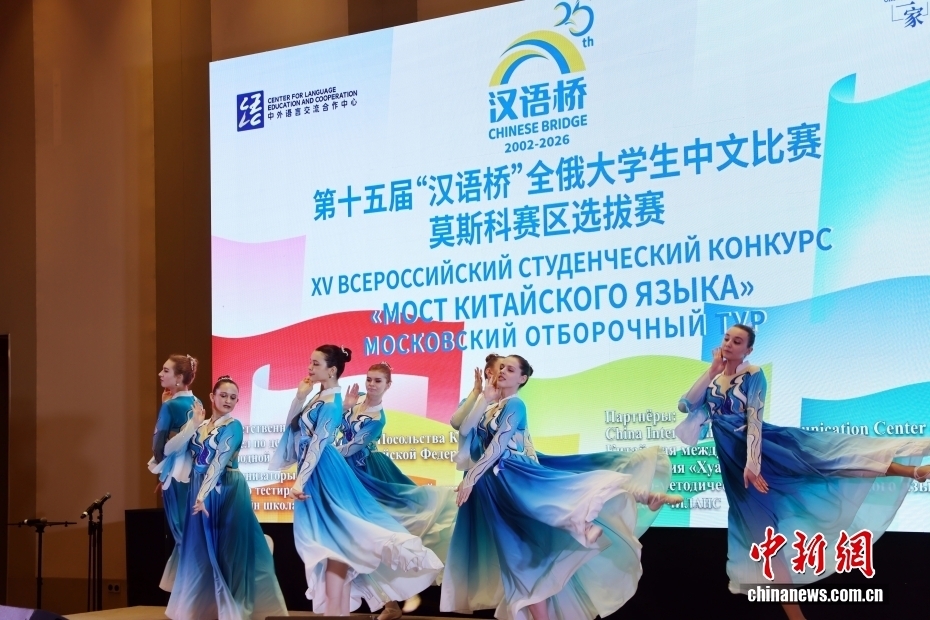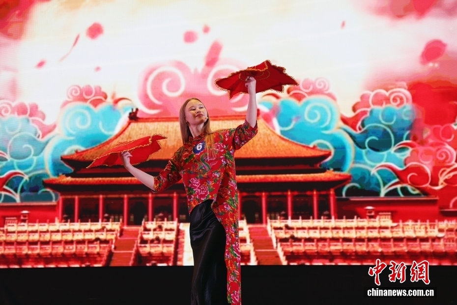 当地时间4月22日,第十五届“汉语桥”全俄大学生中文比赛莫斯科赛区选拔赛在莫斯科中国贸易中心举行。图为参赛选手参加中华才艺展示环节的比赛。