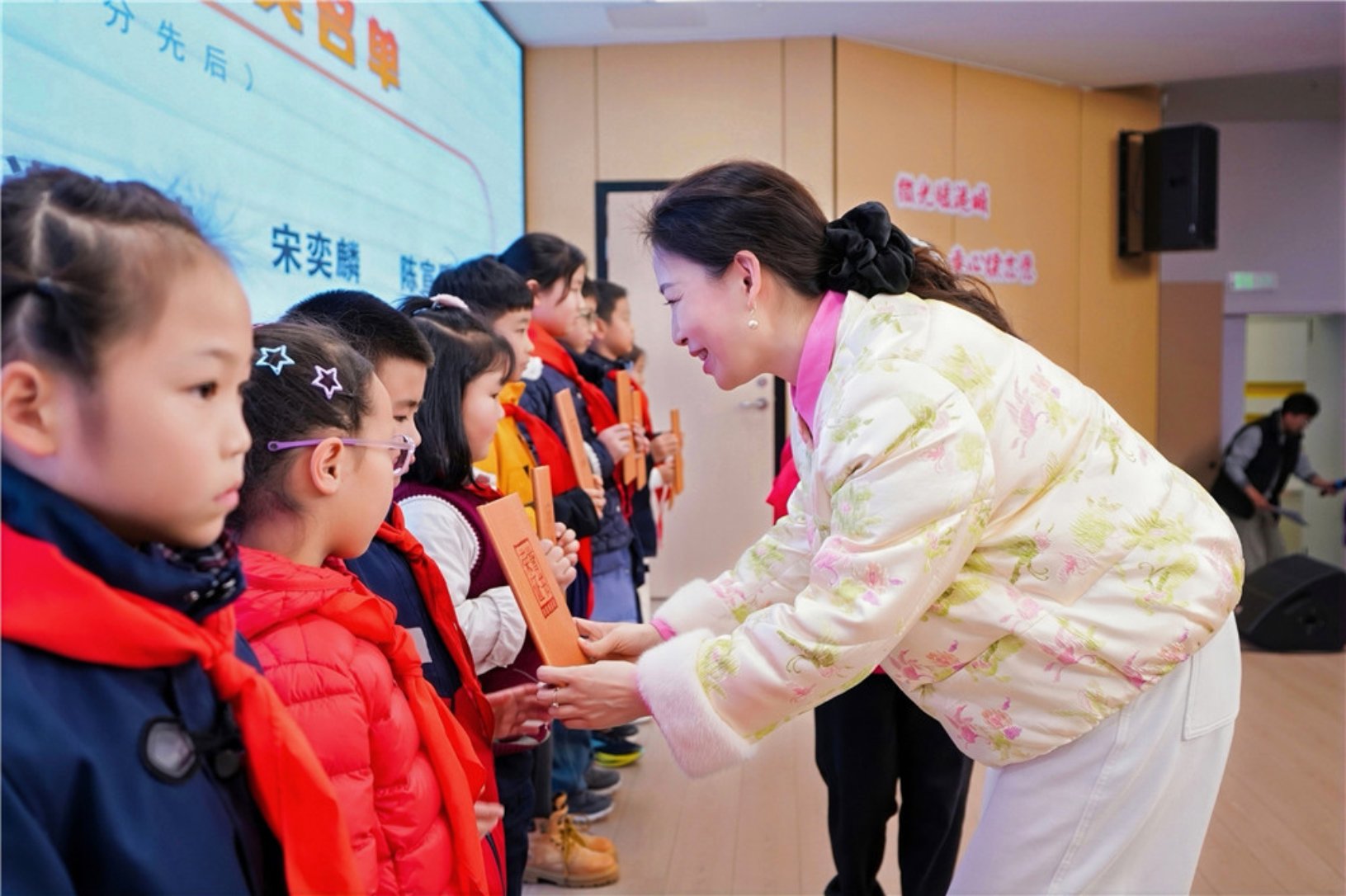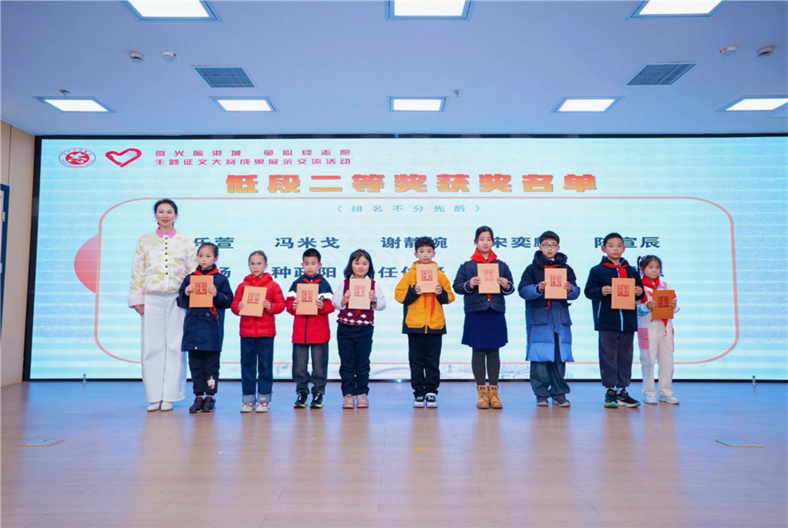 颁奖环节成为现场的暖心亮点,北仑区相关部门领导依次为高段、低段获奖同学颁发奖项,获奖小作者代表李依宸、王淇分享了自己的创作初心与感悟,王宁玥、吴尚臻同学还现场朗诵了获奖作文,用稚嫩却真挚的文字,讲述眼中的志愿故事,传递对志愿者的崇敬与热爱,让现场观众感受到志愿精神在少年心中的萌芽与生长。