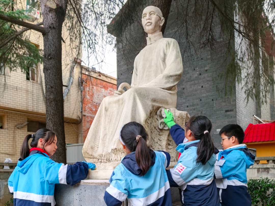 “作为新时代少年,我们不仅要铭记历史,更要传承这份担当。”聆听完徐锡麟烈士的故事,少先队员们都深受震撼。带着对先烈的缅怀和敬意,队员们迅速投入到紧张而有序的雕像擦洗环节中。队员们擦洗起徐锡麟烈士的雕像以及记载烈士事迹的石壁,他们有的负责擦拭雕像表面,有的专注于清理石壁上的污渍,每一个动作都认真细致。