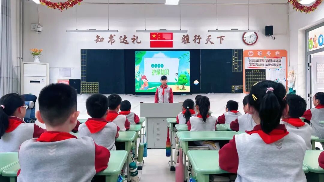 孟春之月,盛德在木。主题队会绿意先行,中队辅导员以图文视频讲植树节由来、树木与地球共生之理。队员耐心聆听,爱绿护绿的理念,如春雨润物,悄然入心。