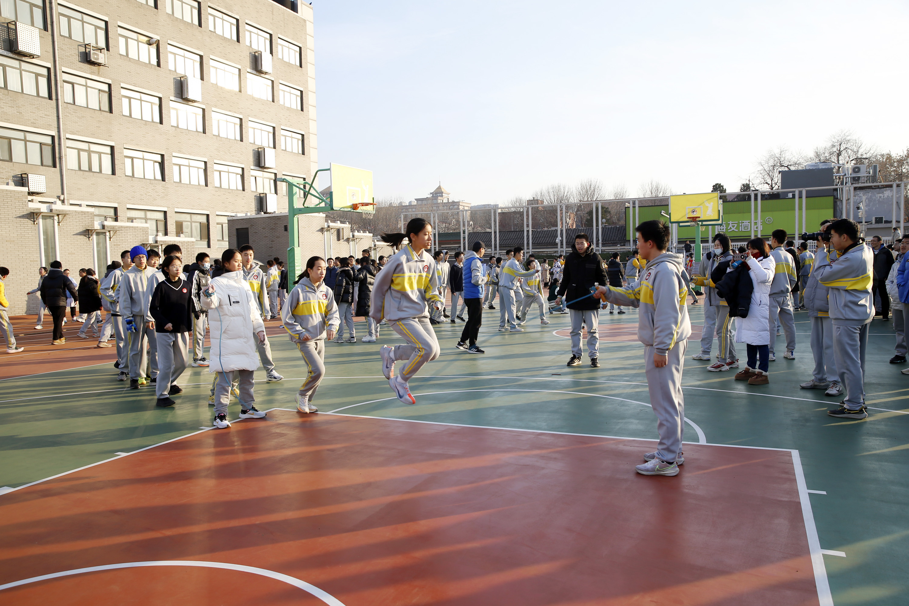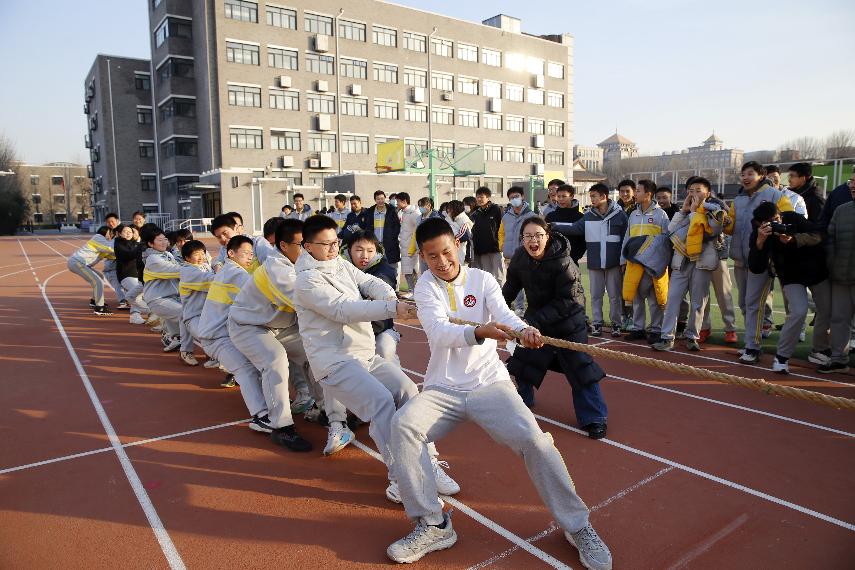 12月5日下午,随着一声发令枪响,北京市二中高一年级500多名学生参与的集体跳绳、班级拔河比赛在学操场举行,从而拉开了《阳光体育-活力冬日 身心共建-奠基未来》冬季体育锻炼的序幕。尽管高中阶段学习紧张,但同学们每天坚持综合体育活动时间不低于2小时,开展了长跑、跳绳、踢毽、立定跳远等适合冬季体育锻炼活动,同时校园篮球赛、足球赛、乒乓球比赛也相继进行。同学们积极参与,决心以健康的体魄,优异的学习成绩完成高中阶段学业,挑战未来。