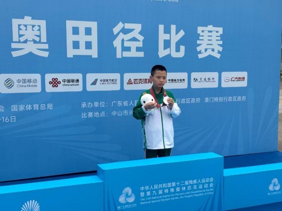 在全国第十二届残疾人运动会暨第九届特殊奥林匹克运动会的领奖台上,10岁的澳门小将王德康稚嫩的脸庞上带着腼腆的笑容,双手紧紧攥着那枚来之不易的垒球项目银牌。