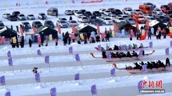 12月20日,“界江逐冰·燃动寒冬”中俄冰上龙舟邀请赛在呼玛激情开赛。 苏宁 摄